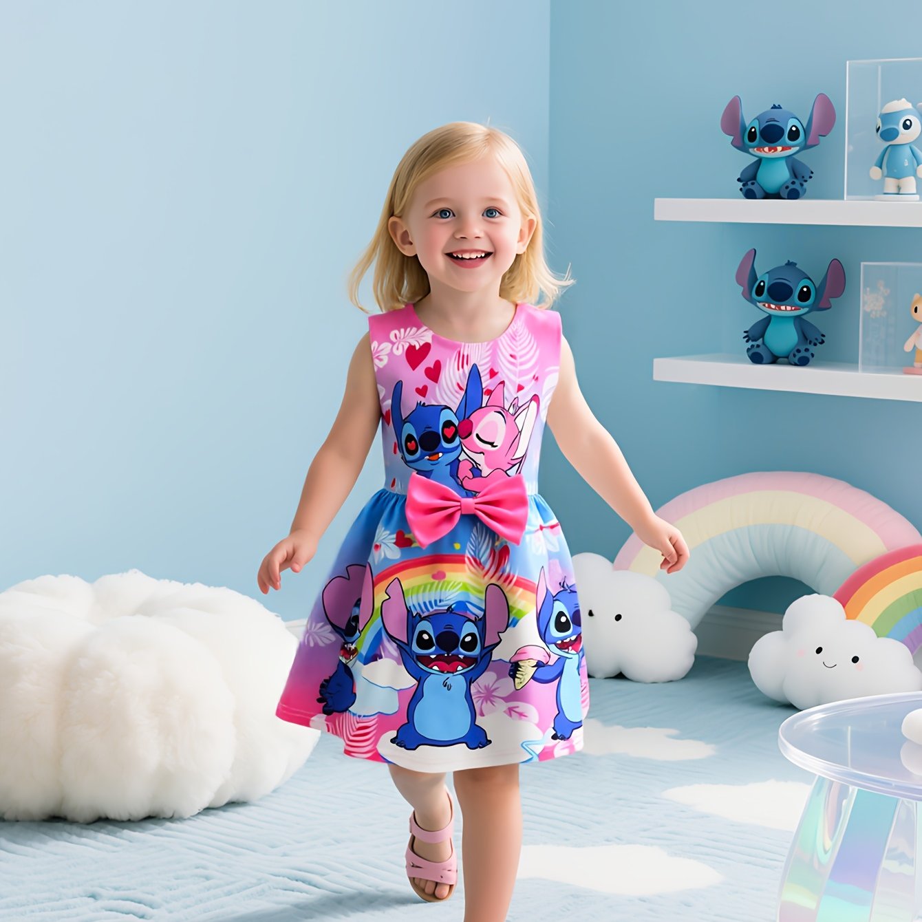 Dieses entzückende Disney Stitch Mädchenkleid vereint verspieltes Design mit Komfort. Hergestellt aus einem weichen, dehnbaren Polyester-Spandex-Gemisch, zeigt es lebhafte Stitch- und Blumenmuster, die durch eine dekorative Schleife in der Taille ergänzt werden. Das ärmellose Rundhalsdesign sorgt für Leichtigkeit und ist perfekt für den Sommer. Ideal für lässige Ausflüge, Feste und als Geschenk, bietet dieses Kleid eine schmeichelhafte reguläre Passform, die Kinder lieben werden.