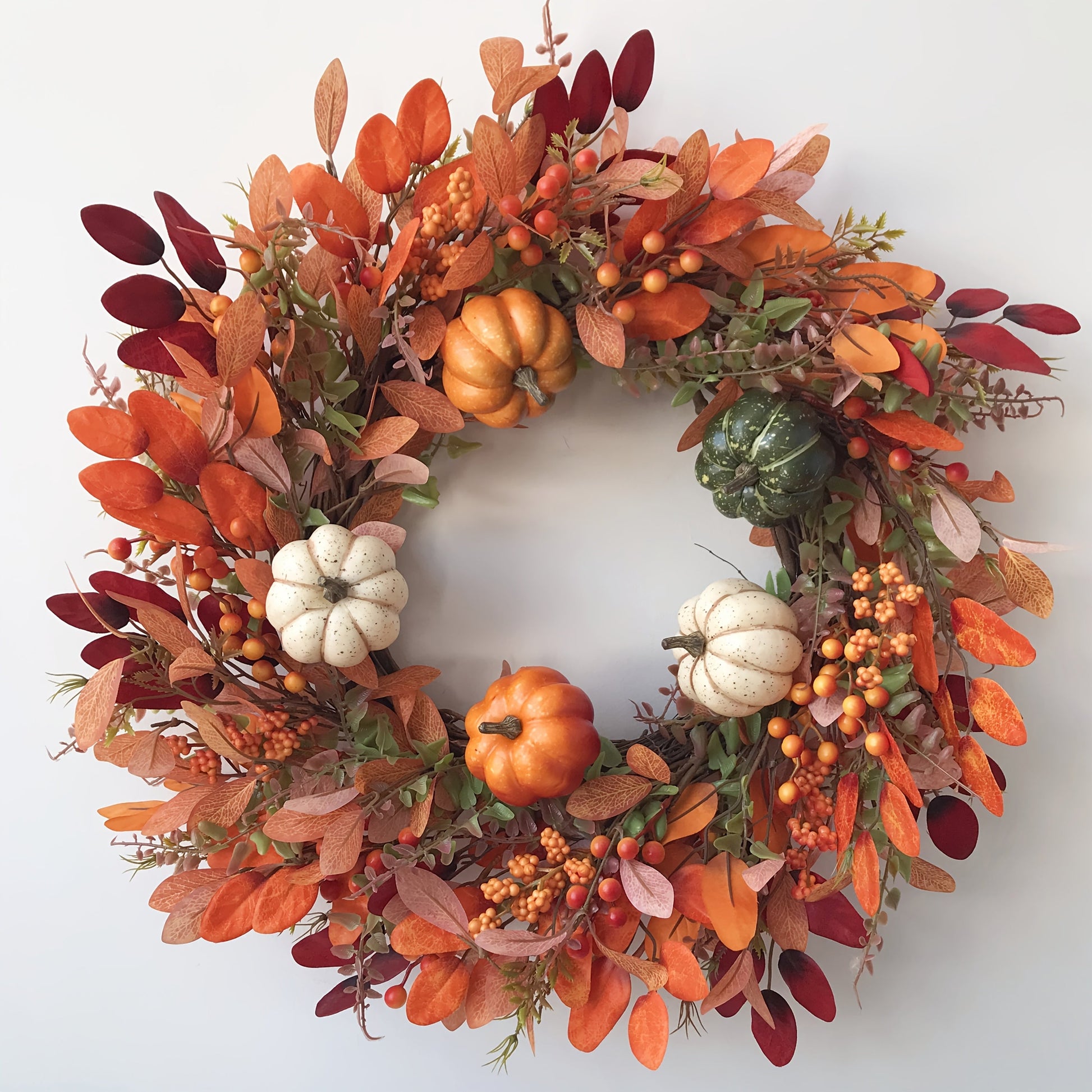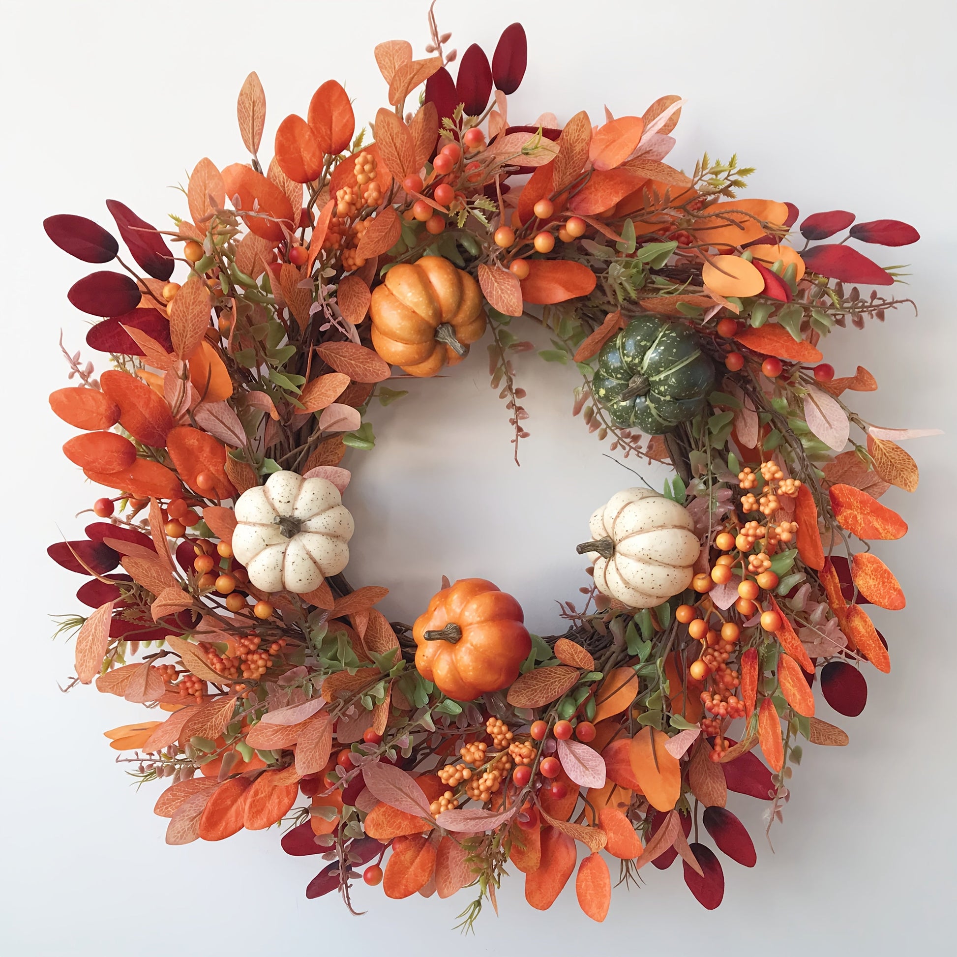 - Verziert mit Kunstkürbissen, Beeren und Eukalyptusblättern