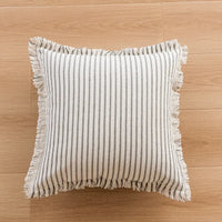 Dieser elegante Kissenbezug kombiniert ein subtil gestreiftes Jacquardmuster mit dekorativen Fransen, was eine warme und gemütliche Atmosphäre schafft. Hergestellt aus einer Mischung von Baumwolle und Leinen, bietet der Bezug eine langlebige und weiche Textur. Perfekt, um deinem Interieur einen stilvollen und natürlichen Look zu verleihen.